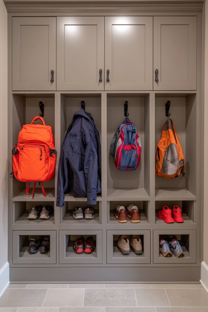 Visualize a row of built-in lockers, each with hooks for coats, hats, and bags, topped with cubbies or baskets for shoes and outdoor gear. The lockers are painted in vibrant or neutral tones, matching your decor. Doors or open compartments keep everything contained while maintaining a clean look. Brightly colored or patterned fabric bins inside add a fun, personalized touch.