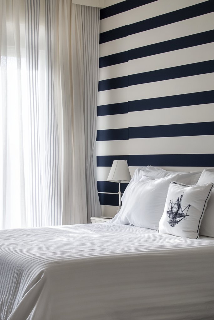 Start with a navy and white striped duvet cover or bedspread as your anchor piece. Complement it with matching throw pillows or cushions. Wall paint should stay neutral—think soft whites or light grays—to let the stripes pop. Choose curtains or blinds with a subtle stripe pattern that coordinates but doesn’t compete. Keep accessories minimal to maintain the clean, crisp look. If you’re feeling creative, add a striped rug to tie the space together.