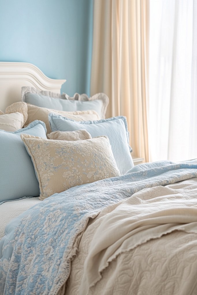 Imagine walls painted in a gentle powder blue, complemented by beige curtains and bedding reminiscent of sandy beaches. Layer in textured textiles—like a linen throw or cotton sheets—that echo natural materials. Accents in darker navy or crisp white provide contrast, making the space feel fresh yet cozy. The overall effect is a tranquil, balanced environment that invites rest.