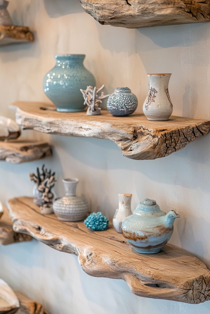 Picture a weathered driftwood plank mounted on the wall, holding a few coastal-themed books, candles, or decorative objects. The natural texture and irregular shape of the driftwood add a one-of-a-kind element to your room. When light hits the uneven surface, it creates subtle shadows that enhance the rustic, beachy vibe. These shelves blend seamlessly with weathered furniture and nautical accessories.
