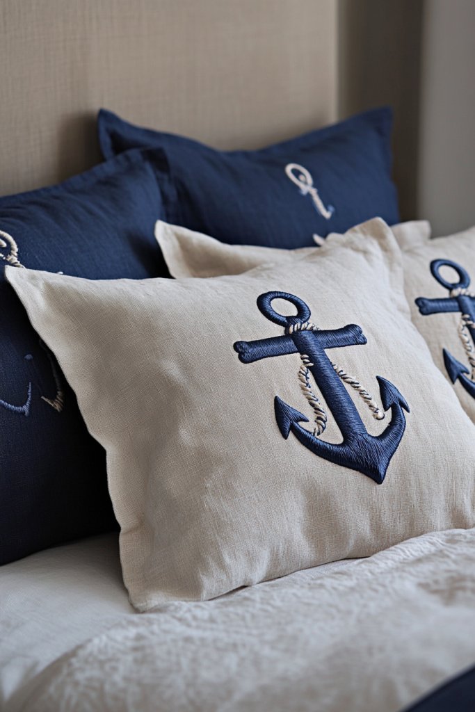 Picture a collection of soft cotton or linen pillows in navy, white, and beige. Embellishments like embroidered anchors, braided rope trims, or appliqued shells add tactile interest. They’re casually arranged on your bed or a cozy chair, creating a layered, inviting look. The mix of textures and motifs evokes seaside serenity and relaxed elegance.