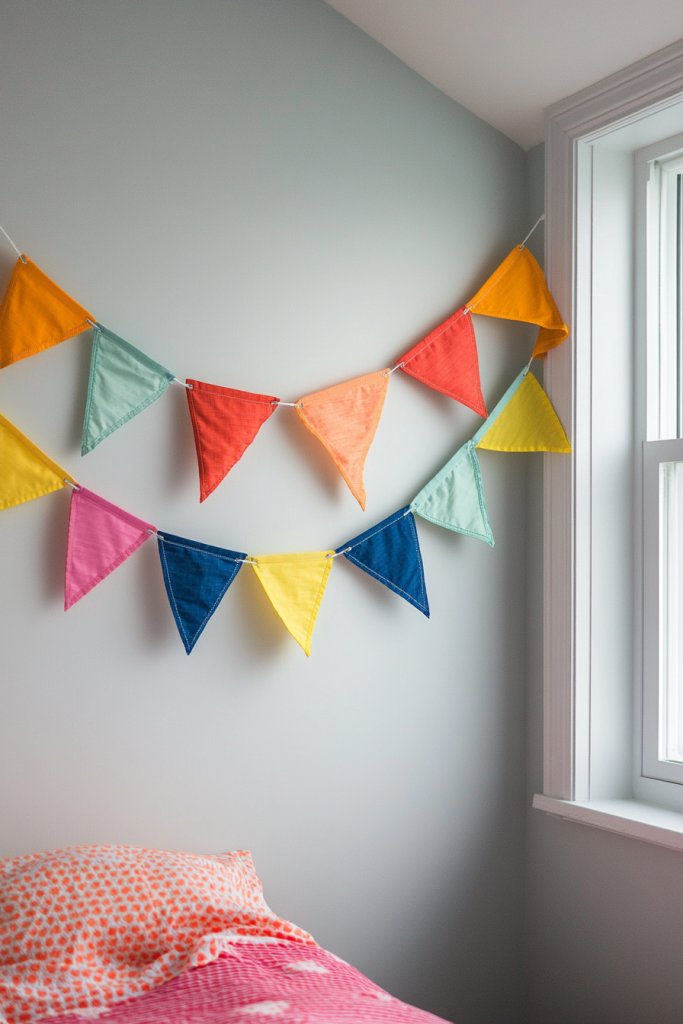 Purchase or DIY your own flag banners using fabric or sturdy paper. Attach to a lightweight string or twine with clothespins or small hooks for easy installation. Measure and plan the placement for symmetry or asymmetry, depending on your style. Secure the ends with hooks or nails, ensuring they’re taut and straight. Keep the banners clean and avoid direct sunlight to prevent fading.