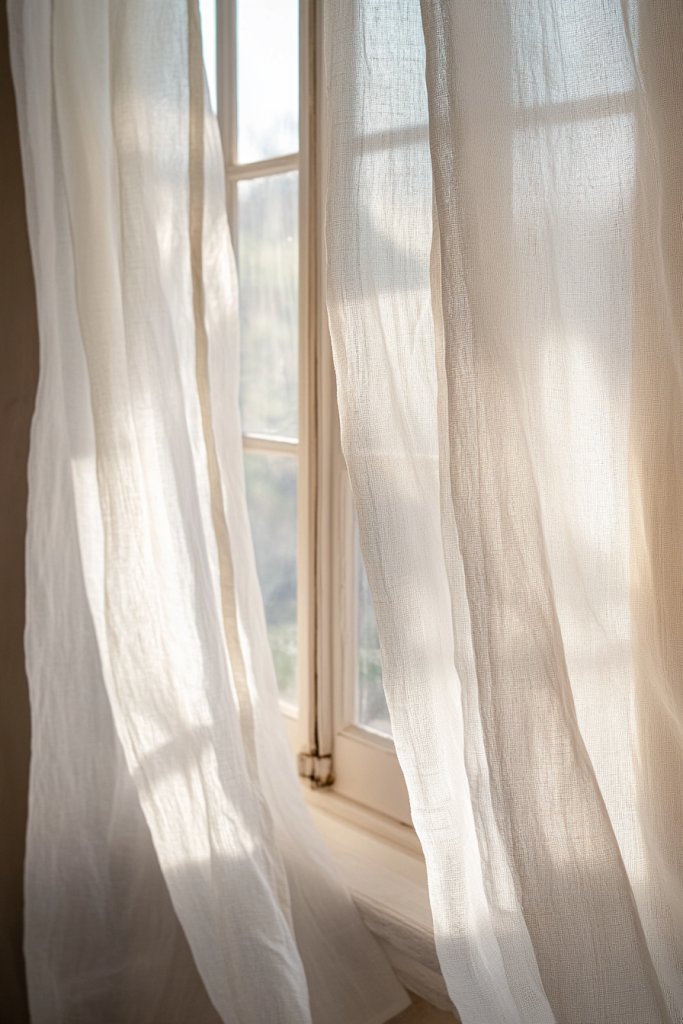 Visualize sheer linen or cotton curtains in white or soft blues, fluttering lightly with a sea breeze. The fabric diffuses sunlight, creating a calming glow that fills the room. Layered with bamboo or wooden blinds, they add texture and depth, reminiscent of beachside verandas. The overall effect is airy, relaxed, and effortlessly stylish.