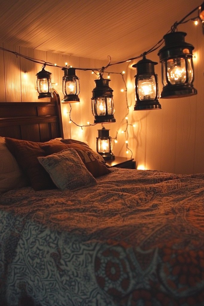 Choose from hanging lanterns, tabletop versions, or wall-mounted styles depending on your space. Metallic finishes like brass or distressed copper enhance the vintage look, while painted wood lanterns can match a rustic or shabby chic theme. They work well in bedrooms with high ceilings or small nooks, offering flexibility. Incorporate string lights inside some lanterns for a twinkling effect.
