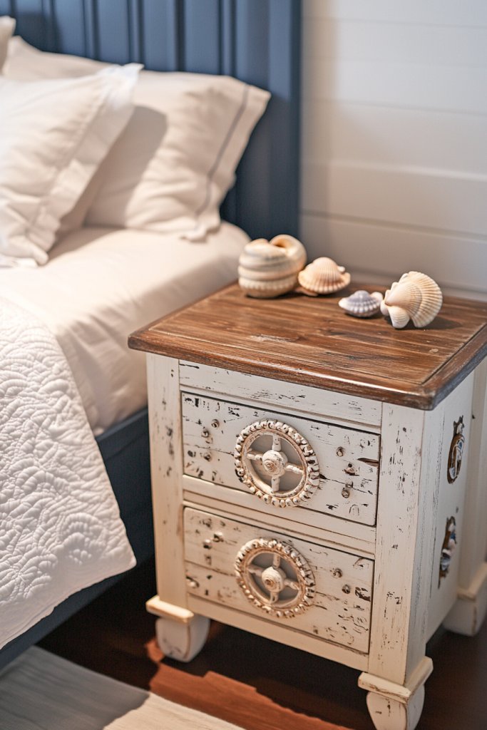 Choose from different materials—reclaimed wood, distressed metal, or painted MDF—to match your style. Incorporate drawers with nautical hardware or rope pulls for added detail. Use open shelves for displaying coastal accessories or storing essentials. The size and shape can vary from compact nightstands to larger statement pieces.