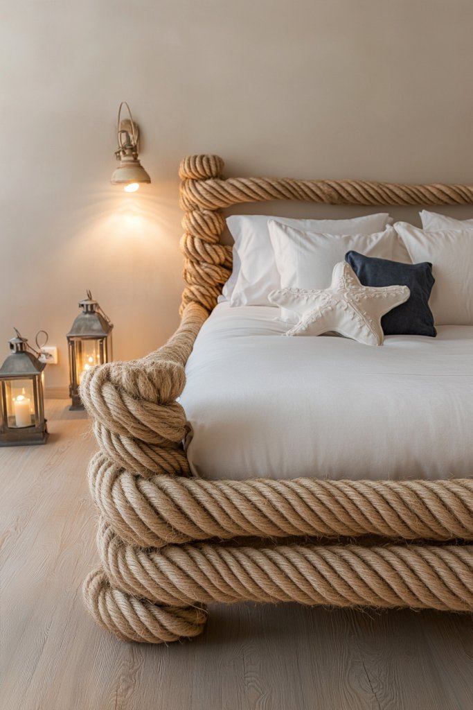 Picture a bed frame wrapped in thick, natural jute rope, creating a rustic, textured outline that’s both sturdy and stylish. Or imagine wall-mounted rope garlands framing your headboard area, adding depth and a tactile element. Small rope accents on drawer pulls or curtain tiebacks add a maritime vibe without overwhelming the space. The textured look pairs beautifully with washed wood and soft textiles, creating a cozy seaside retreat.
