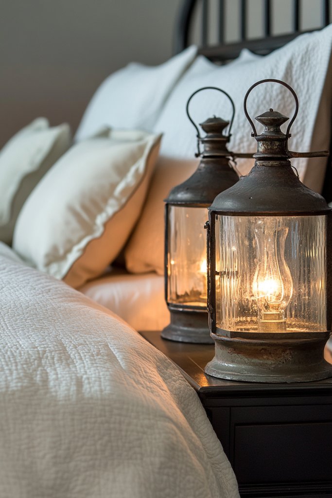 Picture wrought-iron lanterns with glass panes hanging beside your bed, casting a gentle flicker across the room. Their weathered finish and classic design evoke seaside piers or old lighthouse keepers’ stations. The warm amber glow from candles or LED candles inside creates a soothing atmosphere. These lanterns serve as both functional lighting and decorative accents, adding layers of texture and history.