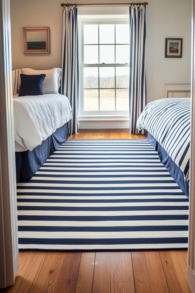 Picture a soft rug with navy and white stripes stretching across the floor, anchoring your bed and furniture. The bold pattern draws the eye downward, creating a visual boundary that organizes the room. Textured or woven materials add a tactile layer that invites barefoot strolls. The stripes evoke classic maritime designs, adding a sense of order and freshness.