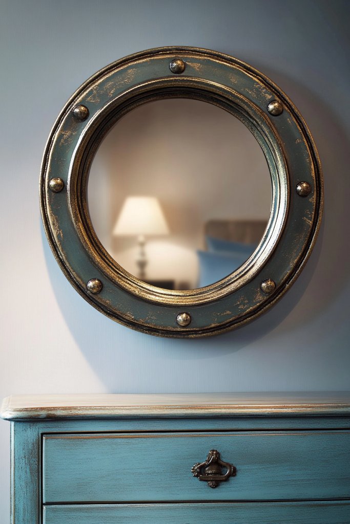 Envision a large round mirror with a brushed brass or distressed metal frame resembling a ship’s porthole. It hangs above your dresser or bed, reflecting light and expanding the room visually. The mirror’s shape and finish evoke vintage maritime vessels, adding character and depth. The reflected light softens the space, creating a calming, open atmosphere.