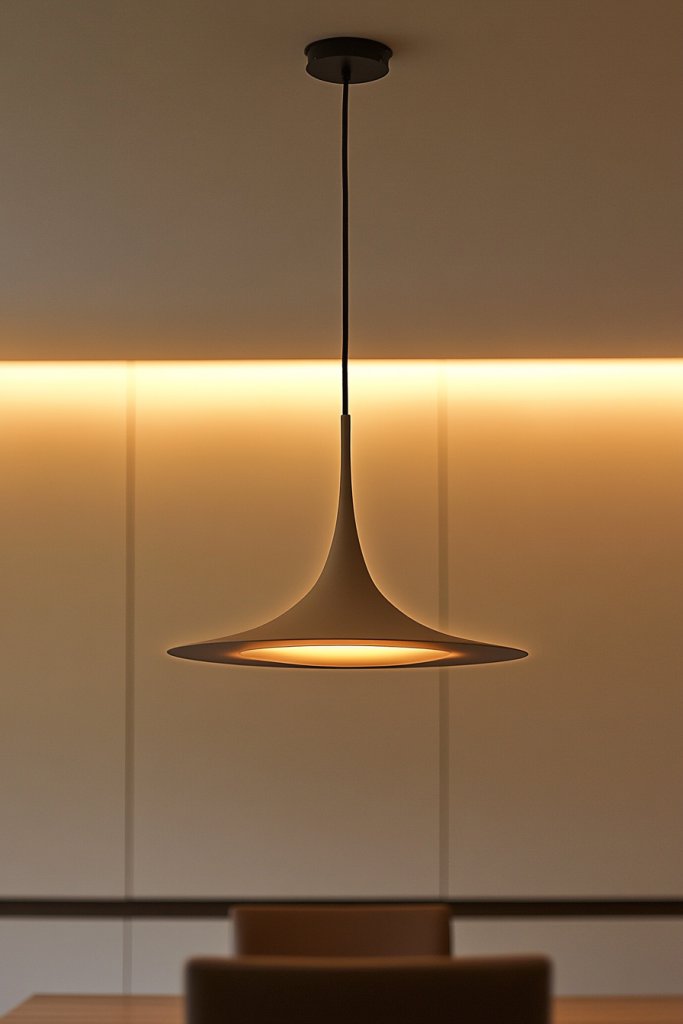Imagine a row of matte black or brushed nickel pendants hanging above a dining table or kitchen island. The sleek, minimalist shapes draw the eye upward, adding a sculptural element to the room. Soft, warm light filters through their neutral shades, creating a cozy glow. The fixtures blend seamlessly with the overall decor, adding a modern touch without clashing.