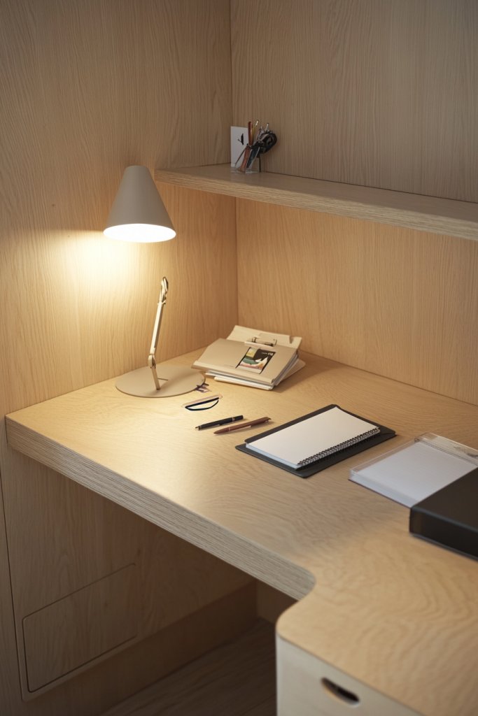 Picture a sleek, compact desk nestled into a corner, made of pale oak or soft ash. It features clean lines, a smooth surface, and subtle storage compartments. A minimalist chair in beige or taupe complements the setup. The space feels organized, with a few textured accessories or a small sculptural piece adding personality. Natural light highlights the wood’s grain, creating a calm workspace.