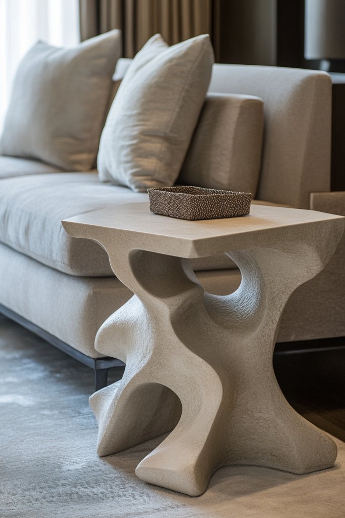Imagine a side table with an organic, sculptural form—perhaps resembling a smooth stone or abstract shape—finished in matte stone gray or beige. It sits beside a neutral sofa or bed, holding a textured lamp or a small decorative bowl. The unique form draws the eye and adds a contemporary touch. Its matte finish softens reflections, enhancing its sculptural qualities.