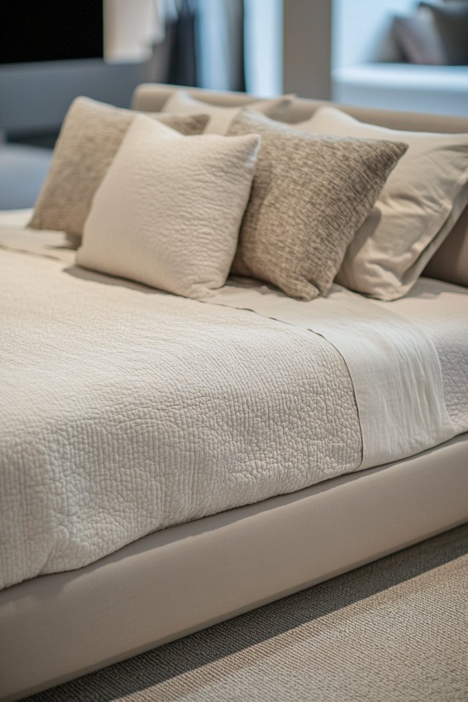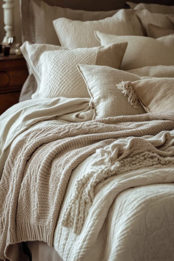Visualize a bed dressed in crisp, neutral sheets with a subtle striped or stitched pattern. A quilted duvet, textured throws, and a variety of pillows in knit, linen, or cotton create a layered, inviting look. Soft lighting highlights the textures, while a plush rug in matching tones grounds the space. The overall effect is calm, sophisticated, and cozy.