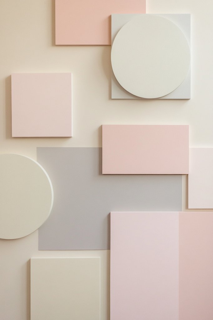 Picture framed prints or panels in shades of blush, taupe, or muted gray, featuring abstract geometric shapes or subtle patterns. Hung in a grid or asymmetrical arrangement, they add a contemporary vibe. The soft tones complement neutral walls and furnishings, creating a balanced focal point. The shapes and lines guide the eye and add visual interest.