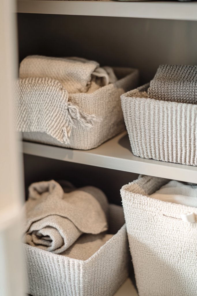 Imagine woven or fabric-lined baskets in shades of beige, stone, or taupe placed on open shelves, under tables, or in closets. They hold everything from magazines and throws to small accessories. The natural textures add warmth and softness, balancing sleek furniture and hard surfaces. When neatly stacked or grouped, they create a tidy, inviting look.