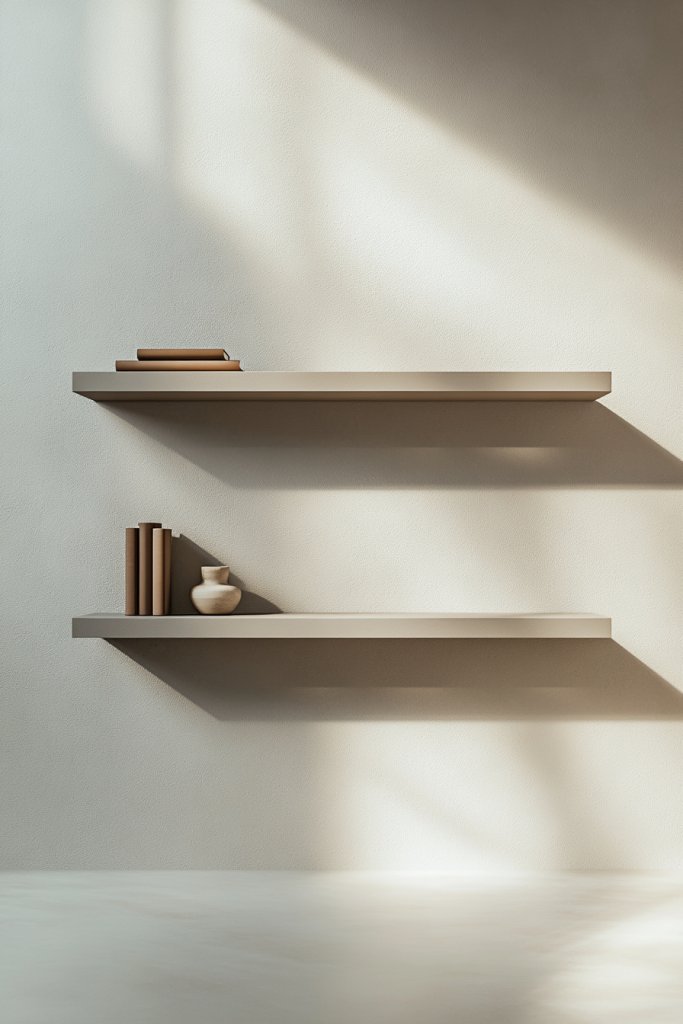Envision slim, matte white shelves mounted seamlessly against a soft beige wall. They hold a few curated books, minimalist ceramics, or small decorative objects—nothing cluttered, just curated. The floating design creates a sense of openness, making your space appear larger and more organized. Soft shadows cast by the shelves add subtle depth.