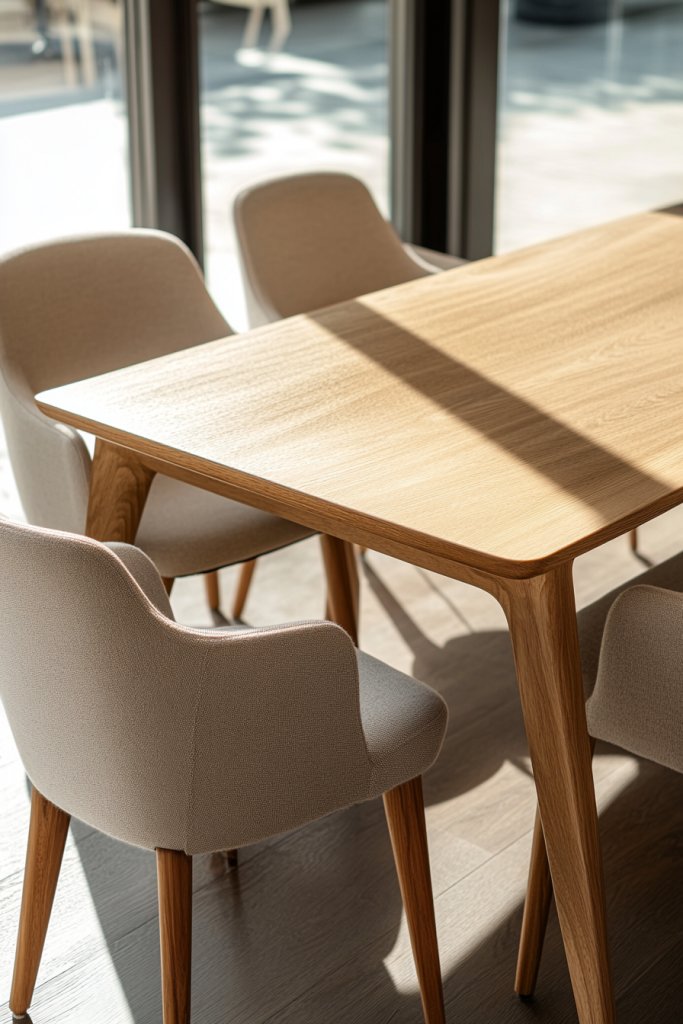 Imagine a rectangular table crafted from pale oak or ash, its surface smooth and matte. Surround it with minimalist chairs in neutral upholstery—think beige, gray, or taupe—featuring slim metal legs or simple wooden frames. The combination creates a balanced, airy look that invites gatherings. Soft ambient light highlights the natural grain of the wood, emphasizing its understated elegance.