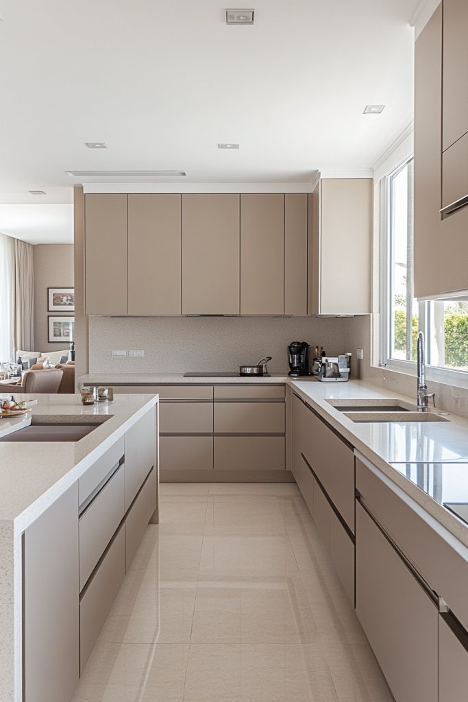 Picture a kitchen with flat-panel cabinets in soft gray or taupe, seamlessly blending into the open living area. The counters are clear and clutter-free, with hidden storage solutions keeping things tidy. The space feels airy, with natural light flooding in from large windows. Modern hardware in matte black or brushed nickel adds a subtle accent without overpowering the simplicity.