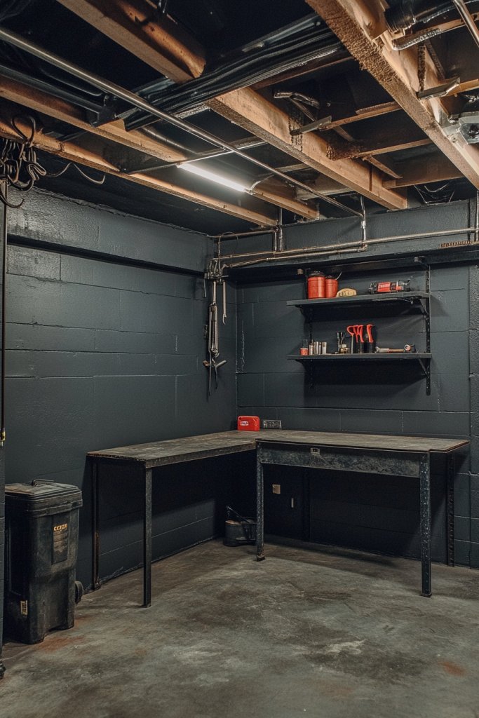 Looking to add depth and edge to your garage or basement? Neutral charcoal walls give an industrial vibe that feels both modern and rugged. It’s the perfect backdrop for metal fixtures, exposed beams, and raw materials. Who says utilitarian spaces can’t be stylish?