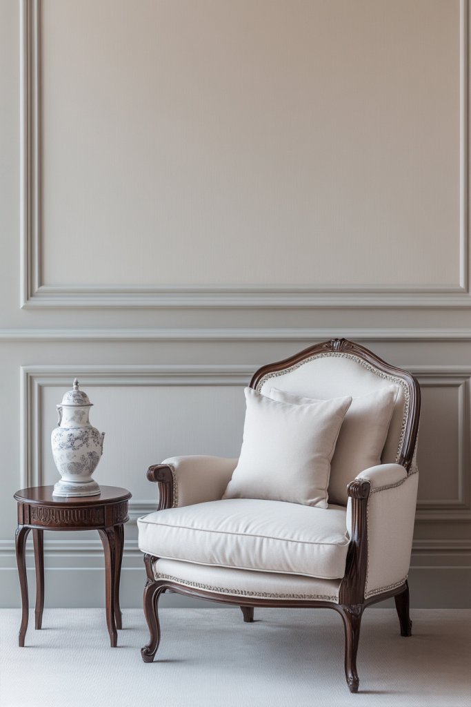 Add visual interest with textured wallpaper or wainscoting painted in a slightly darker shade for contrast. During different seasons, switch up the accessories—like adding a decorative console or seasonal artwork. For a more traditional look, incorporate vintage-style mirrors and classic lighting fixtures. This color palette is highly adaptable, suiting both modern and vintage styles.