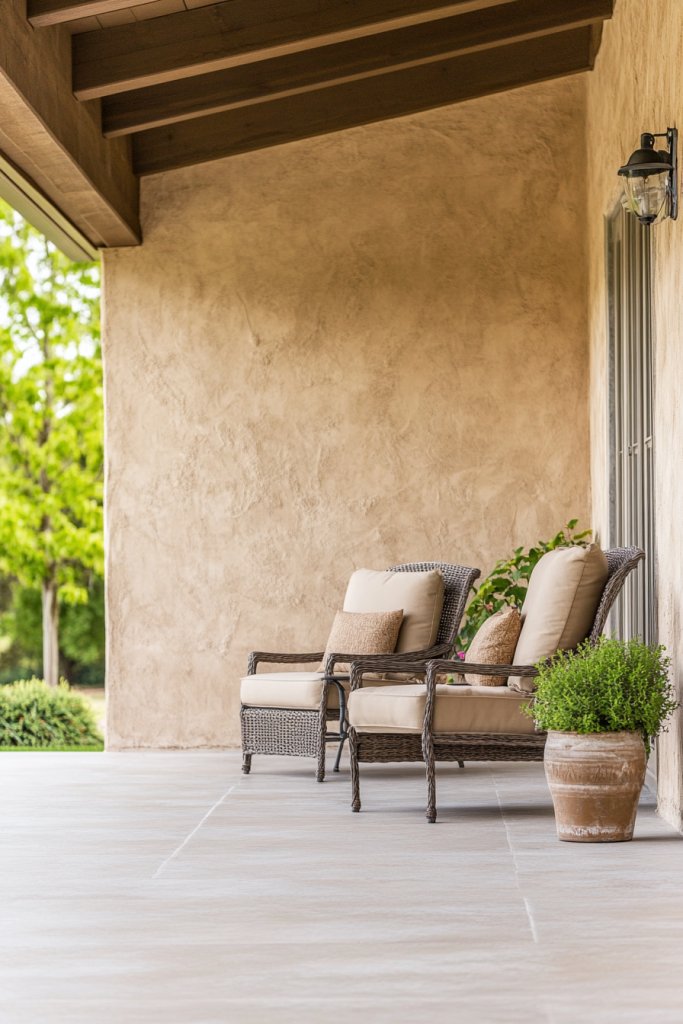 Imagine a covered patio with sandstone-colored walls, complemented by weather-resistant furniture in neutral shades. Soft, textured cushions and outdoor rugs in sandy tones add comfort and tactile interest. Light fixtures with warm bulbs cast a gentle glow, emphasizing natural textures. Potted plants in earthy pots complete the look, creating a tranquil outdoor retreat that feels like an extension of your home.