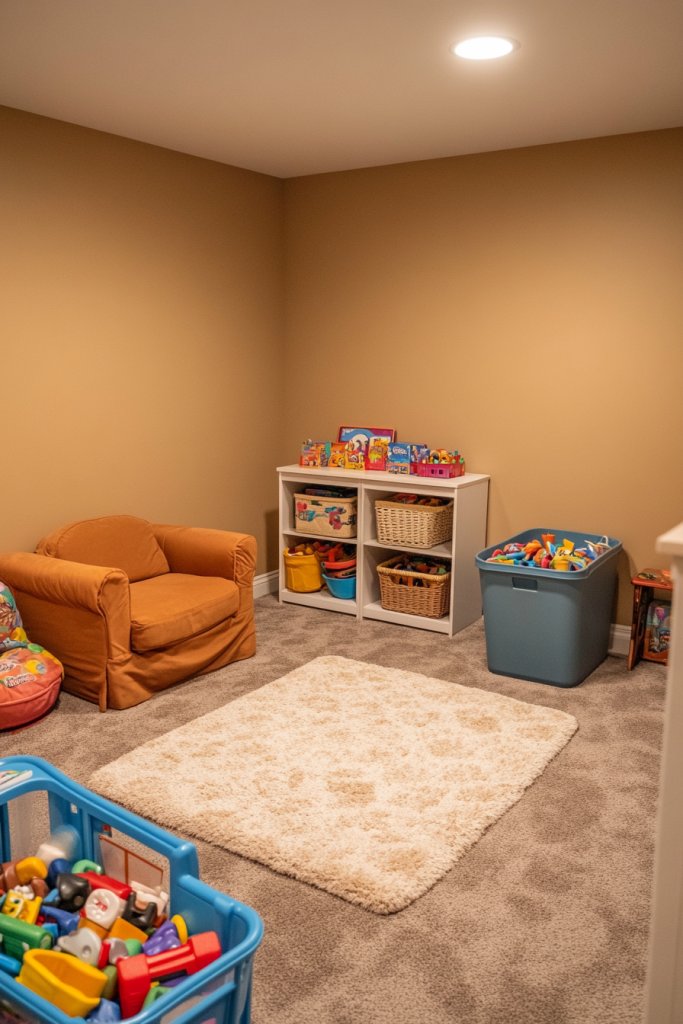 Paint the walls with a high-quality, washable biscuit-colored paint in a matte or satin finish. Use durable, stain-resistant flooring—like vinyl or rubber—that’s easy to clean. Incorporate plenty of storage solutions—bins, cubbies, or shelves—in bright colors or natural wood. Keep the space clutter-free by designating specific areas for toys and activities. Add soft, textured rugs and cushions for comfort.