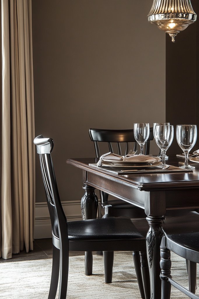 Paint the walls in a high-quality, matte taupe that complements your flooring and furniture. Select a sleek, dark wood or lacquered table and add elegant upholstered chairs to soften the look. Incorporate layered lighting—dimmable sconces or a statement chandelier—to create a warm, inviting glow. Use textured fabrics and metallic accents to add depth and visual interest. Keep clutter minimal for a polished appearance.