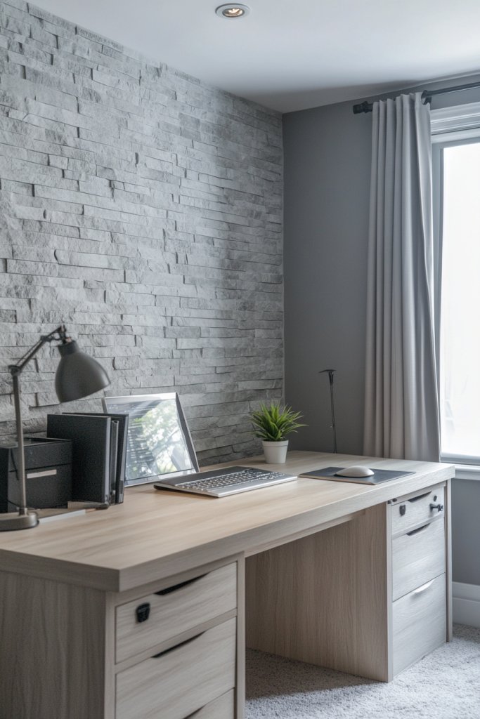 Use a high-quality, low-sheen paint in a soft stone gray for walls. Keep furniture simple—think sleek desks, filing cabinets, and ergonomic chairs in neutral shades. Add layered lighting—desk lamps, sconces, or adjustable overheads—to reduce eye strain. Incorporate textured textiles such as a woven rug or fabric-covered cork boards. Keep clutter hidden with smart storage solutions, making the space feel open and organized.