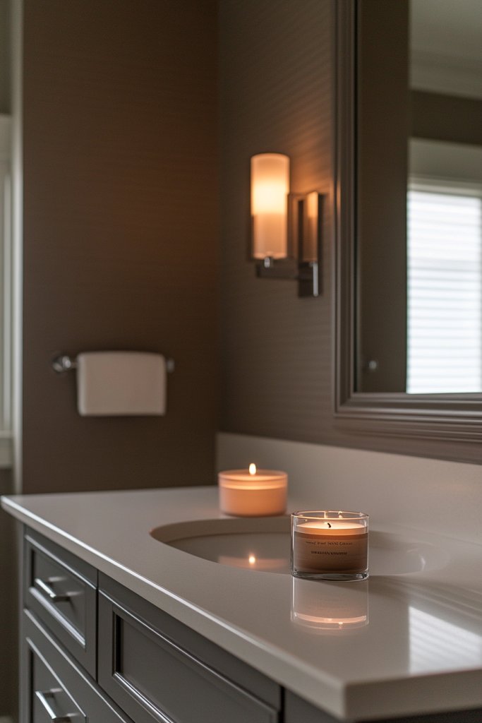 Pair dusty mushroom with crisp white or light beige tiles for a fresh look. Add warmth with textured towels or woven baskets for storage. In smaller bathrooms, keep fixtures sleek and minimalist to avoid cluttering the space. During different seasons, subtle changes like soft textiles or decorative containers can refresh the vibe.