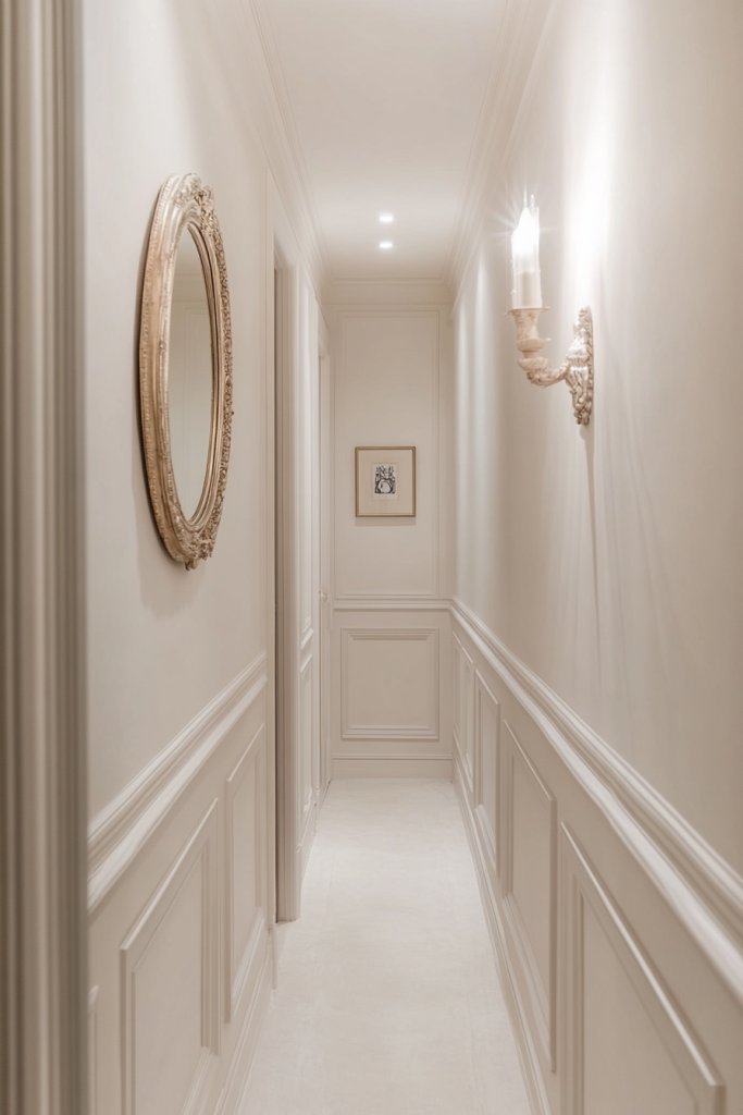 Imagine a hallway with crisp, ivory walls reflecting warm light from sleek wall sconces or a subtle chandelier. Framed mirrors in gold or silver hang along the length, bouncing light and creating the illusion of space. A runner with a subtle pattern in neutral tones adds texture underfoot. The overall look is refined, bright, and inviting, encouraging guests to explore further.
