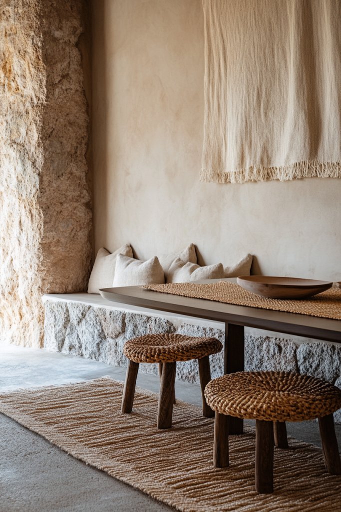 Picture linen or hemp table runners in muted tones layered over a wooden table, complemented by jute or braided rugs beneath the dining area. Cushions or seat pads made of natural fibers add coziness and a rustic charm. The textures evoke a sense of craftsmanship and sustainability, enriching the room’s organic vibe.