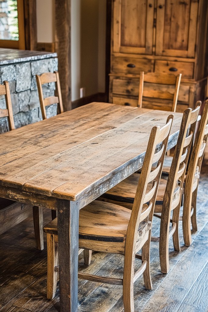 Visualize a dining table made from reclaimed wood, its surface full of knots and imperfections that speak of history. The chairs might be vintage finds restored with eco-friendly finishes. Incorporate recycled metal accents or glass in light fixtures and accessories. The overall look is rugged yet refined, rich in texture and history, telling a story of sustainability.