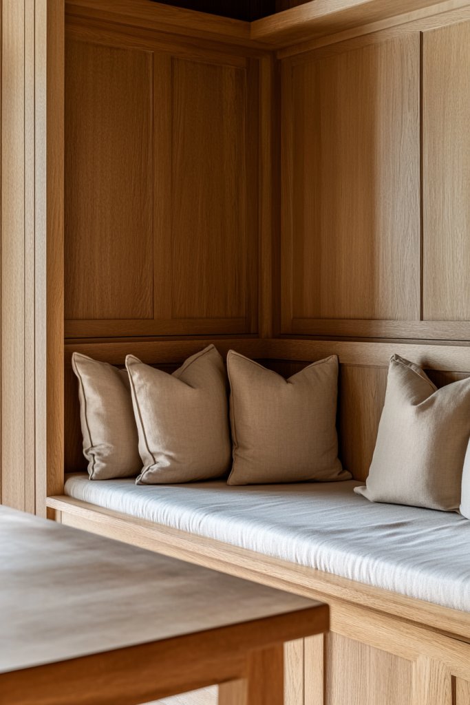 Imagine a long, wooden bench built into the wall, upholstered with a neutral fabric that matches the room’s organic vibe. The bench runs along the length of the wall, offering ample seating without cluttering the room. Its clean lines and integrated design make the space feel streamlined and intentional. The simplicity of the built-in encourages a relaxed, communal atmosphere.
