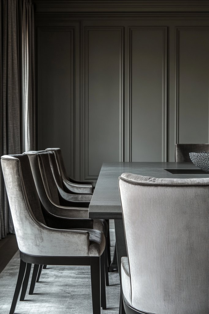 Imagine a space with shades of soft gray or warm taupe, layered through different textures: matte ceramics, glossy metal accents, natural wood, and plush textiles. The room feels unified yet dynamic, with light playing differently on each surface. The consistent palette ties all elements together into a seamless, refined environment.