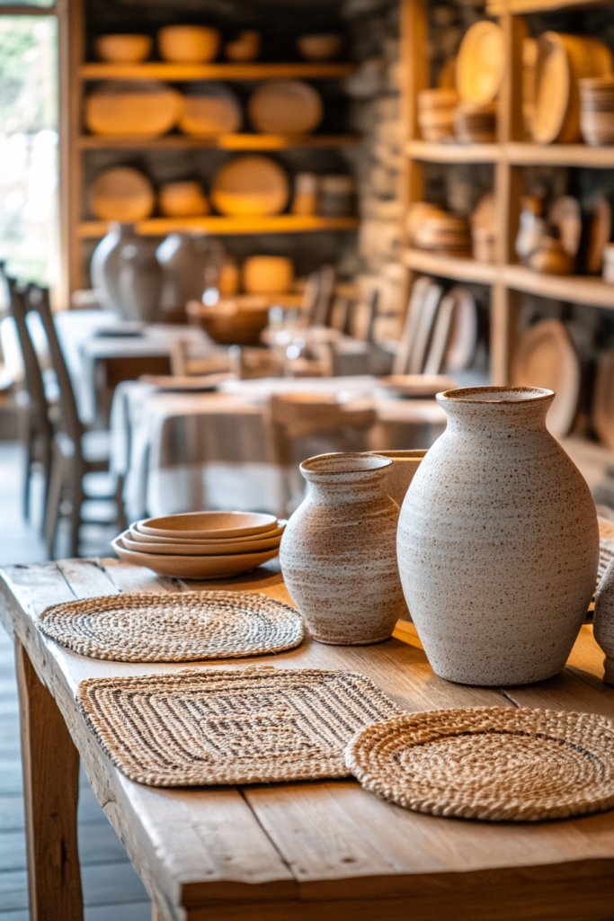 Visualize a dining table with a handcrafted wood base, its surface showing brush strokes or subtle imperfections that highlight artistry. The lighting fixtures are sculptural, made from woven fibers or clay, emphasizing natural, organic forms. Artisanal ceramics, textiles, or furniture pieces add layers of character and tell a story of craftsmanship.