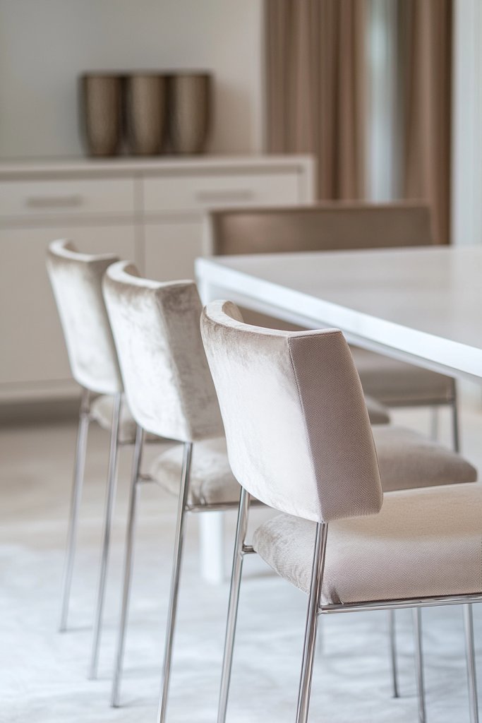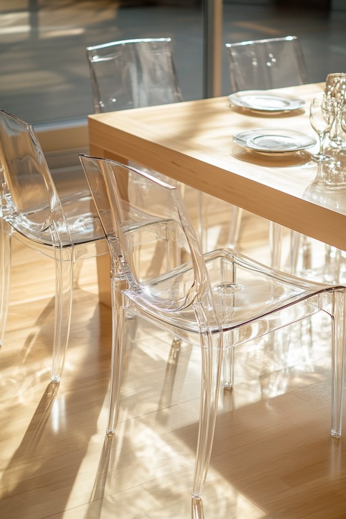 Picture a set of transparent acrylic chairs or light-toned upholstered seats with slim legs, arranged around a minimalist table. The chairs blend into the background, allowing your eye to focus on the textures and materials of the room rather than the furniture. The space feels less crowded, with sightlines unobstructed and natural light bouncing freely.