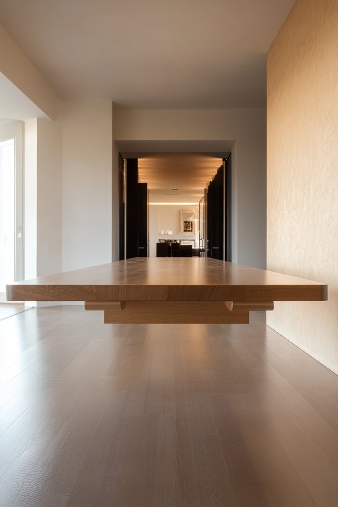 Picture a sleek, rectangular table seemingly suspended in mid-air, supported by discreet hidden brackets or cantilevered supports. The tabletop is made of light-colored wood or stone, with smooth edges that blend seamlessly into the surroundings. Underneath, the floor remains visible, emphasizing the room’s openness. Ambient lighting highlights the floating effect, making the entire room feel spacious and modern.