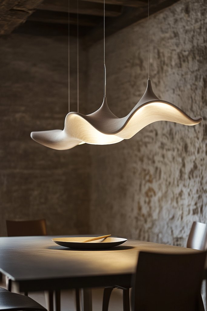 Imagine pendant lights with flowing, asymmetrical forms crafted from woven fibers, clay, or metal. Their irregular shapes cast warm, diffused light that mimics natural patterns. Positioned above a simple table, these fixtures create a dynamic visual effect, adding movement and life. The room feels curated, with a hint of handcrafted artistry that draws the eye.