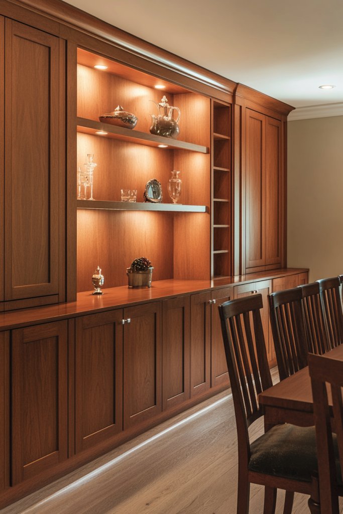 Cluttered spaces can ruin the serenity of an otherwise beautiful dining room. Built-in storage offers a sleek solution that keeps essentials hidden yet accessible. It’s all about combining functionality with elegant design, especially when using warm wood tones.