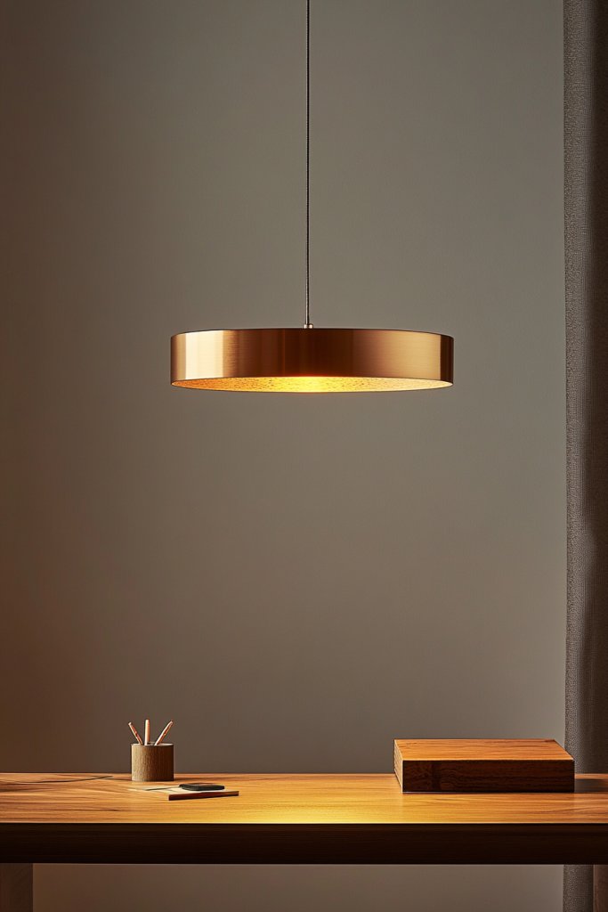 Picture a sleek, matte brass or copper pendant hanging above your desk, casting a soft, warm glow. Its simple, elegant silhouette complements natural textures like wood and linen, creating a balanced, inviting atmosphere. The warm metallic sheen adds just enough subtle shine without overpowering the organic aesthetic. It’s a statement piece that feels effortless yet refined.