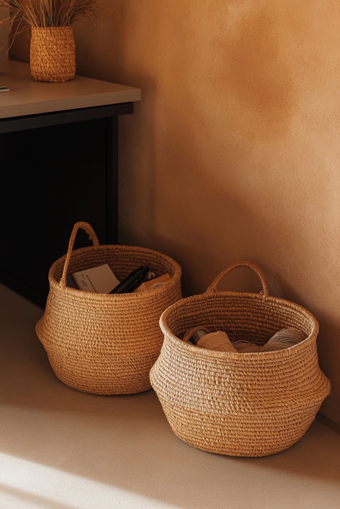 Woven baskets not only organize but also beautify your workspace, making it feel thoughtful and intentional. They promote a calm, clutter-free environment that enhances focus. When your storage looks good, your mindset follows suit. Ready to embrace artisanal organization?