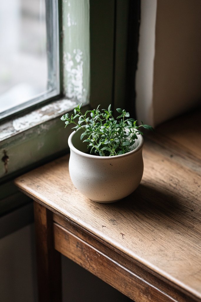 Choose minimalist, modern containers in neutral or earthy tones that blend into your decor. Small herbs like thyme, chives, or lavender can be kept in compact pots that don’t require much space. For desks with limited room, wall-mounted or hanging planters work beautifully. Rotate seasonal herbs or small flowering plants to keep the environment lively.