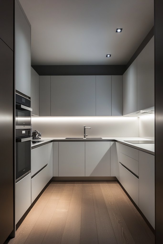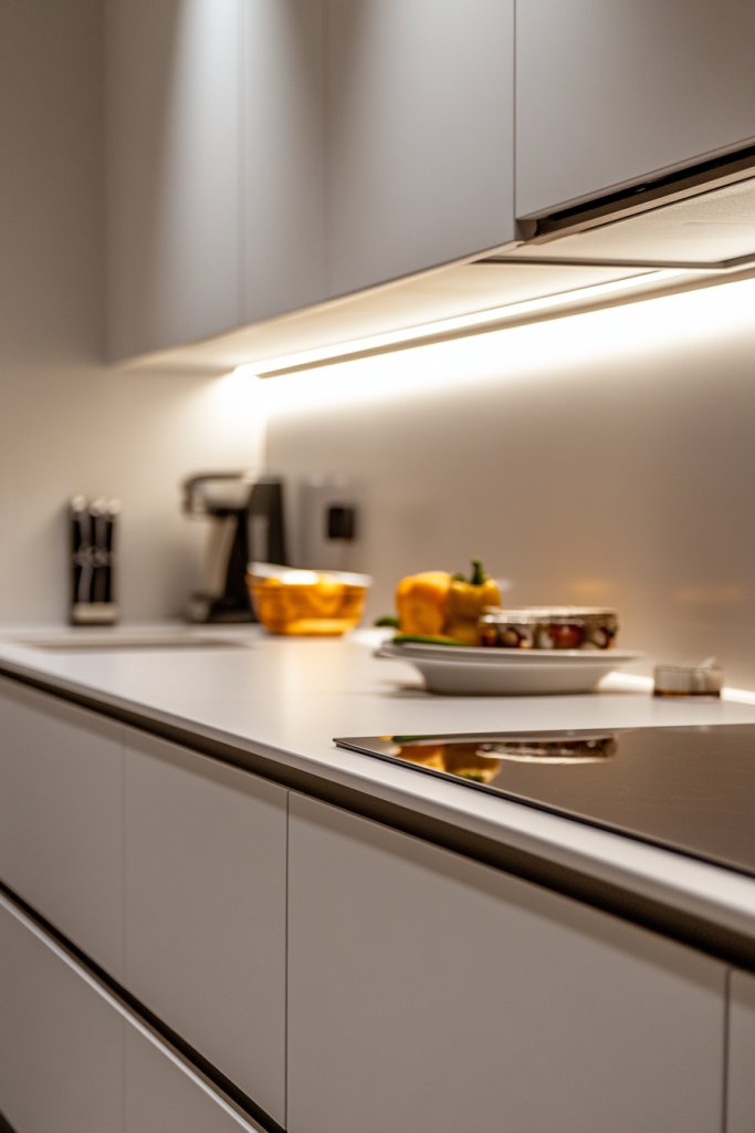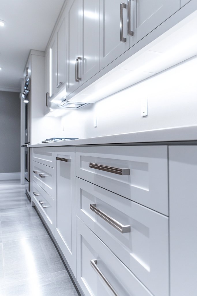 Select handleless cabinetry with high-quality hinges and soft-close features. Use a precision drill or router for clean, flush installation. Apply a durable, matte white finish that resists fingerprints and smudges. When installing, ensure all cabinets are aligned perfectly for a seamless look. Consider professional installation for a flawless, modern finish. Regular cleaning involves wiping surfaces with a soft cloth to maintain the sleek look.