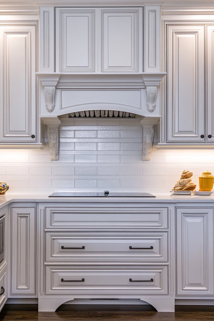 Imagine cabinets featuring crown molding, paneling, or ornate trim painted in crisp white. These decorative elements cast subtle shadows, adding depth and dimension. When paired with soft lighting, they create a regal, crafted look that commands attention. The contrast between smooth surfaces and detailed moldings creates visual interest and a high-end feel.