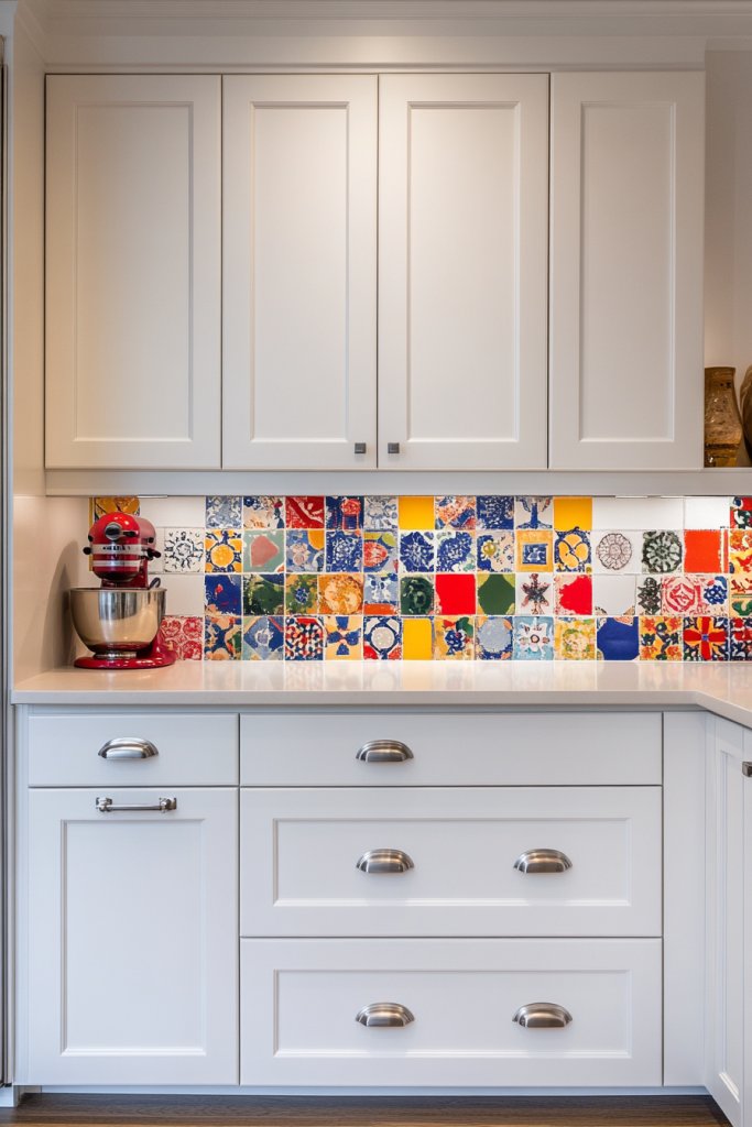 Incorporate personalized touches like handmade or artisanal tiles. Use colorful textiles or accessories that echo the backsplash’s hues. Add under-cabinet lighting to enhance the vibrant effect. Personal items like a vintage clock or a set of colorful jars can tie the look together without cluttering.