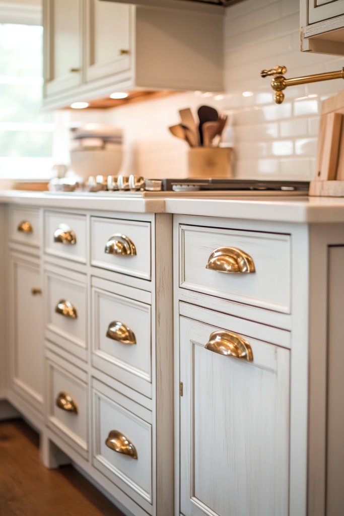 Picture cabinets painted in a gentle, creamy white with aged brass or brushed gold hardware featuring intricate details. The hardware’s vintage style adds personality and a sense of history. The combination creates a warm, welcoming ambiance reminiscent of classic kitchens. Soft lighting and classic accessories complete this charming look.