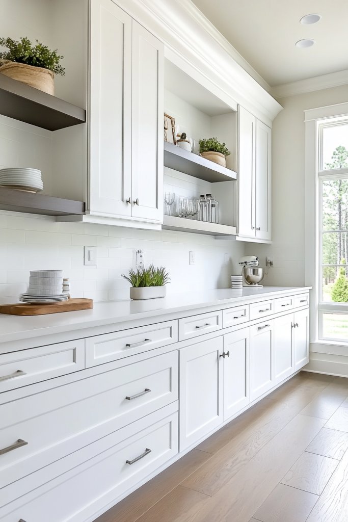 Want a kitchen that’s both practical and visually open? White cabinets combined with open shelving offer a light, airy feel while providing easy access to essentials. It’s perfect for those who love to showcase their favorite dishes or organize with style. If you seek a space that feels spacious and functional, this setup is your answer.