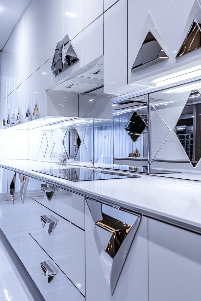 Choose hardware in geometric shapes like triangles, hexagons, or abstract forms made from stainless steel, matte black, or brushed gold. Install with precise alignment using a template or a level to keep lines straight. Use a high-gloss white finish on cabinets, ensuring smooth, reflective surfaces. Clean regularly with non-abrasive cleaners to preserve shine. Professional installation maximizes visual impact and accuracy.