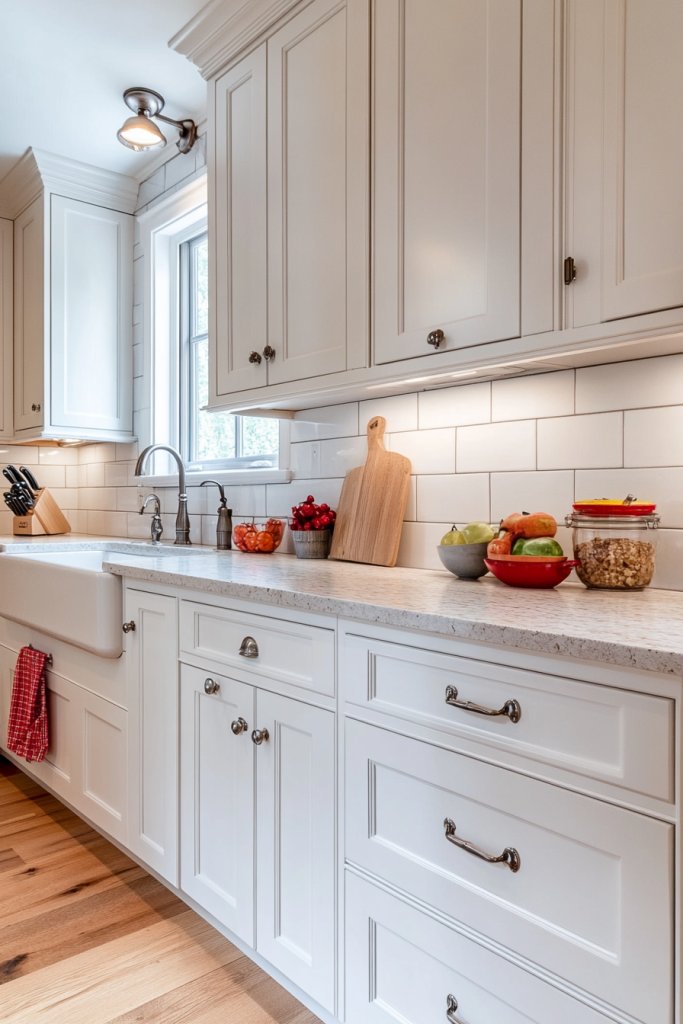 Matte white works well in both contemporary and farmhouse styles, especially when paired with natural textures like linen or jute. For a cozy vibe, add warm-toned hardware or open shelving with decorative ceramics. In modern spaces, pair with black or brushed gold accents for contrast. During different seasons, layer in textiles like soft throws or textured curtains to enhance the tactile appeal.