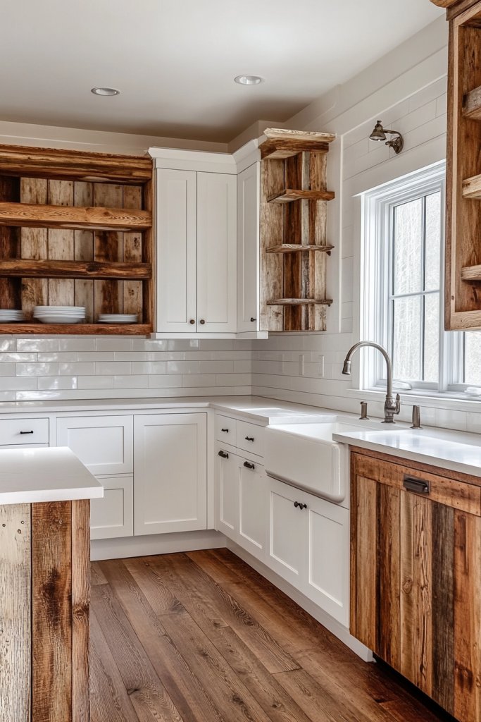 Imagine crisp white cabinets with distressed or stained wood trims, open shelves, or decorative panels. The rough-hewn textures of reclaimed wood contrast beautifully with the smooth, painted surfaces. Layer in warm lighting and textured textiles like burlap or linen to amplify the rustic charm. The combination creates a tactile, inviting environment that feels both fresh and nostalgic.